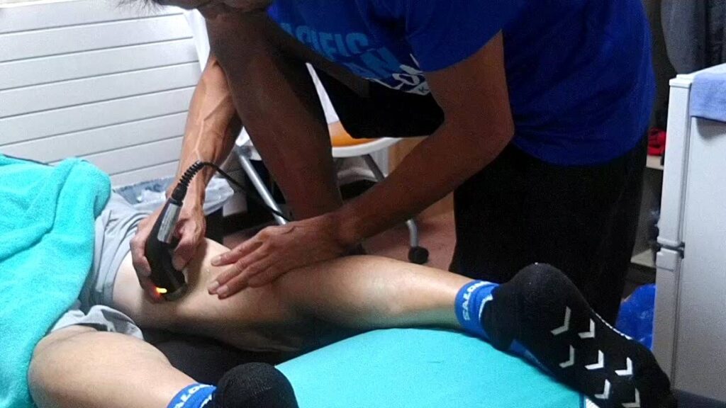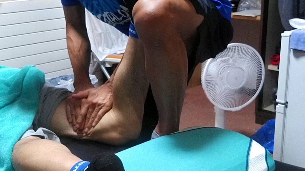 不調部位(この場合はハムストリングス)に対して、マッサージを行っている様子。