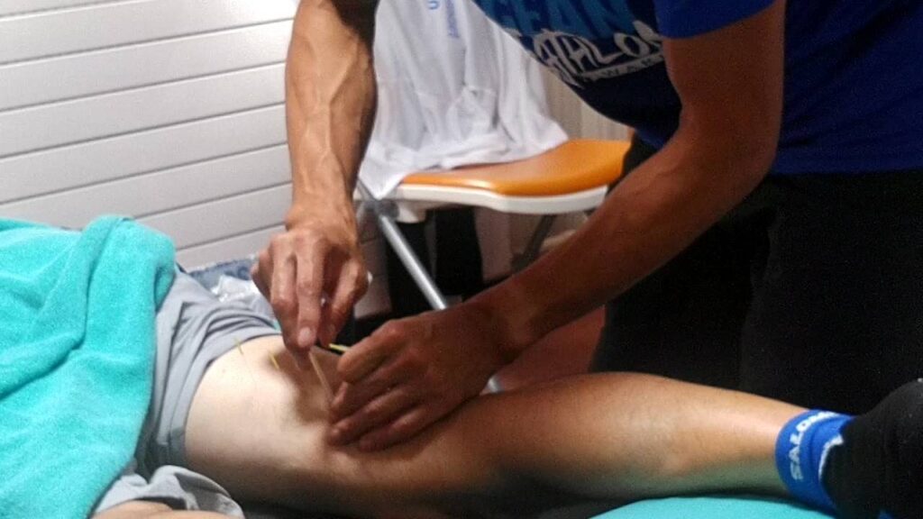 患者は肉離れの後遺症を訴えている(スプリント時の張り感や不安感など)。患部の状態を適切に把握して、用いる技術や方法を選択(この場合は鍼や物理療法など)。