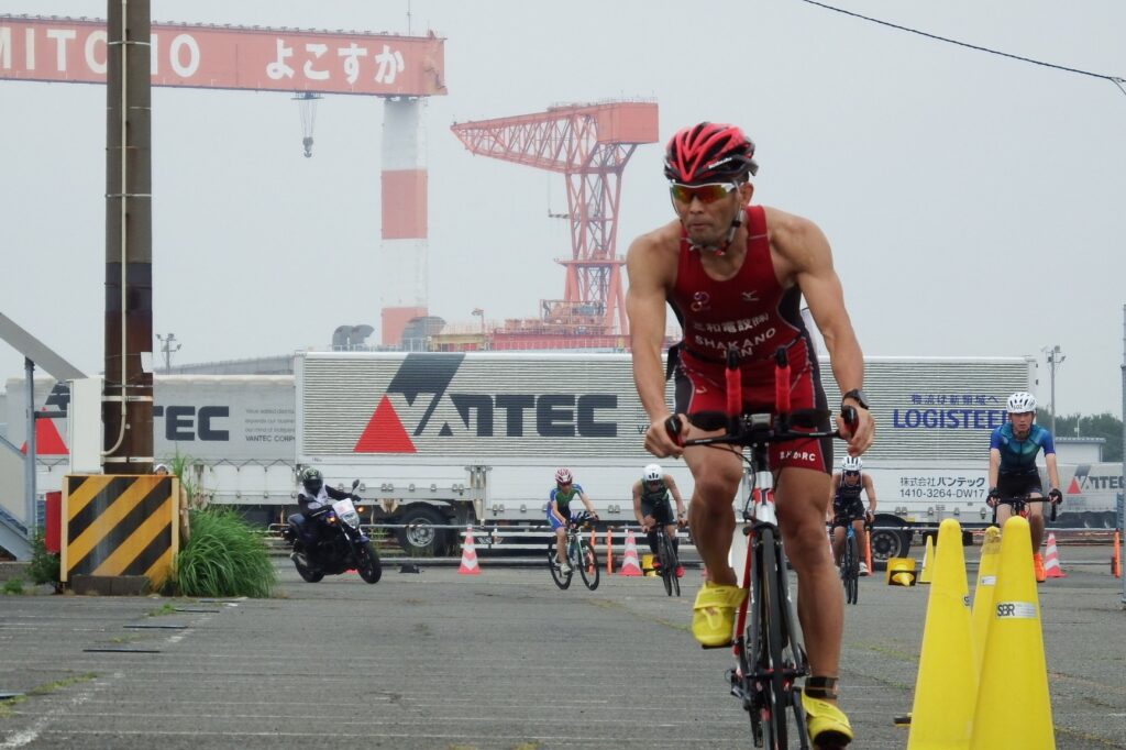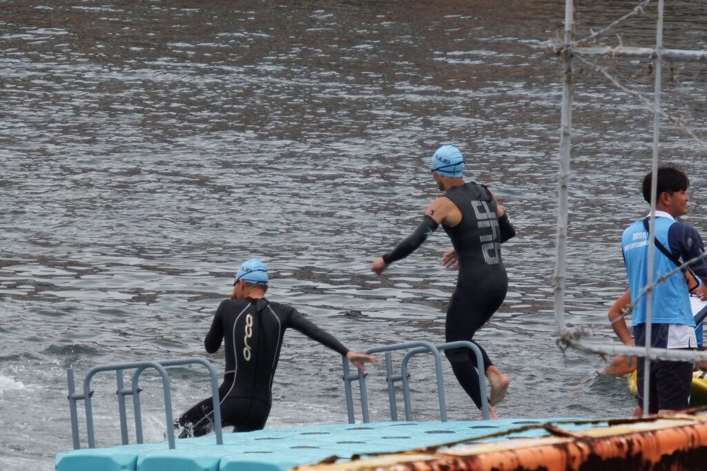 スイムは水温が19~20℃とやや低め。NISSAN CUPは試泳が出来ないので、事前に水に入っての確認は出来ないのですが、冷たいだろうな、と思ったのでロングジョン(袖無しウェットスーツ)にアームカバーを追加して、レースに臨みました。