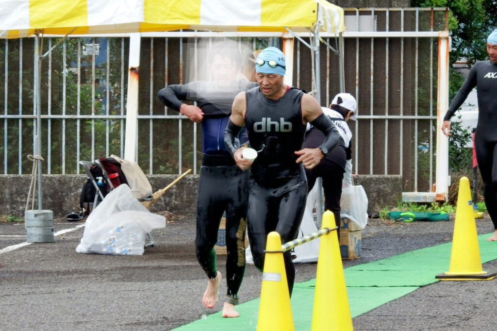 スイムアップからトランジションエリアへの導線で、いつもは走りながらウェットスーツを脱ぐのですが、前日土曜日のスイム練習にて、ウェットを脱ぐ動作確認をしていたら、いつもご一緒させてもらっている速いスイマーの方に、
