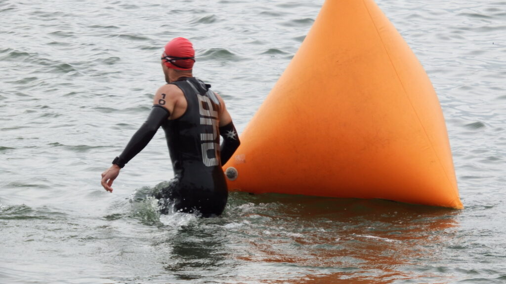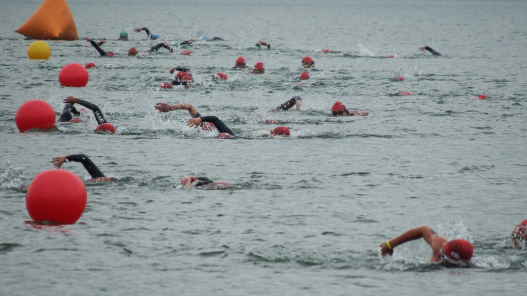 スイムコースは、昨年までは一直線の往復(片道350m)2周でしたが、今年は三角形のコースを2周に変わりました。