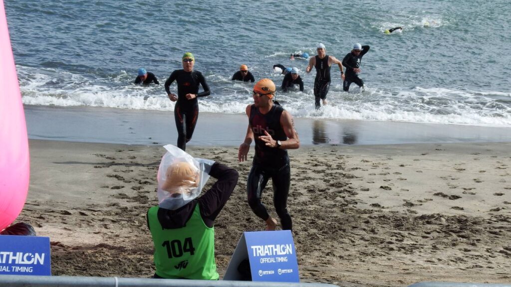 スイムは沖に行くほど波が強く、特に2周目(2x750m)は沖で泳ぎながら転覆しそうになるほどの強くて高い波の直撃を受けて、ゴーグルが少しずれるほどの衝撃でした。波のてっぺんから砂浜の目指すべき設置ブイを見たとき、かなり上から見下ろしたように見えたので、相当波が高いんだろうな、と思いながら泳ぎました。