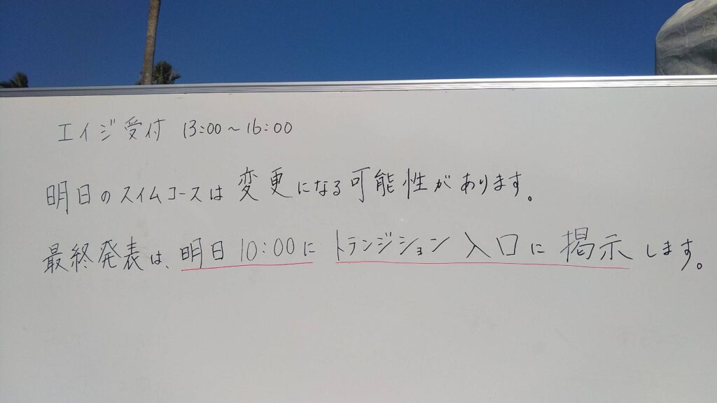 海は荒れ気味、大会本部からは翌日レースでのスイム距離変更の可能性もある旨、告知されていました。