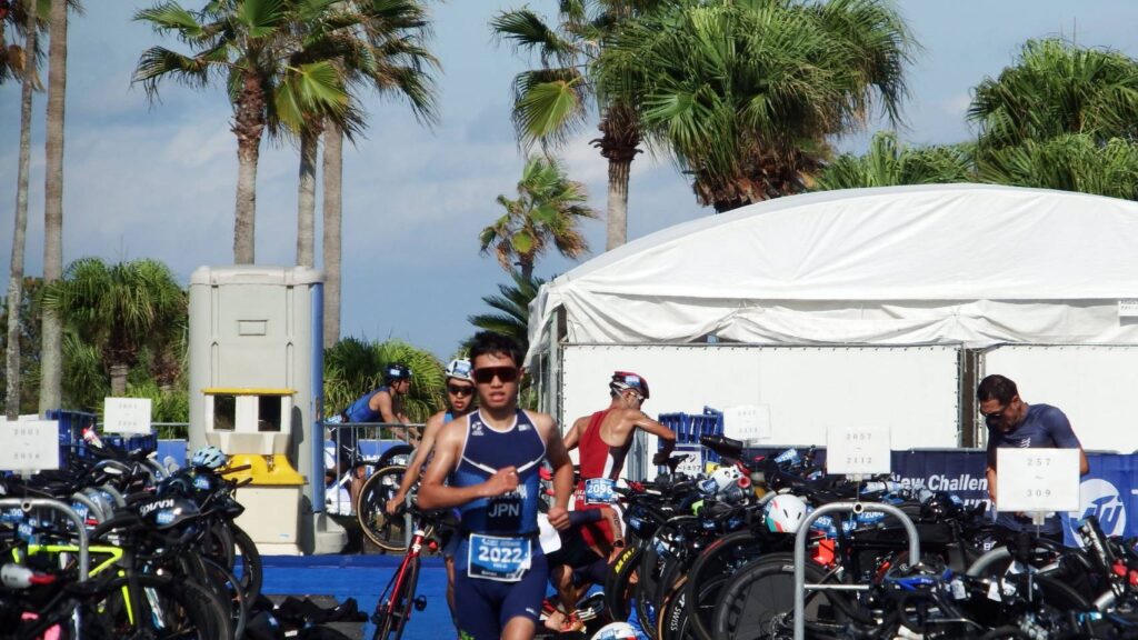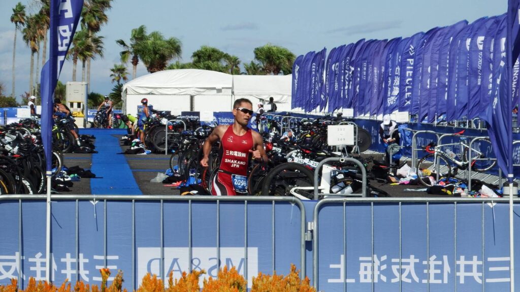 バイクを終えてトランジションエリアの自分のラックにバイクを戻して、ランをスタート。