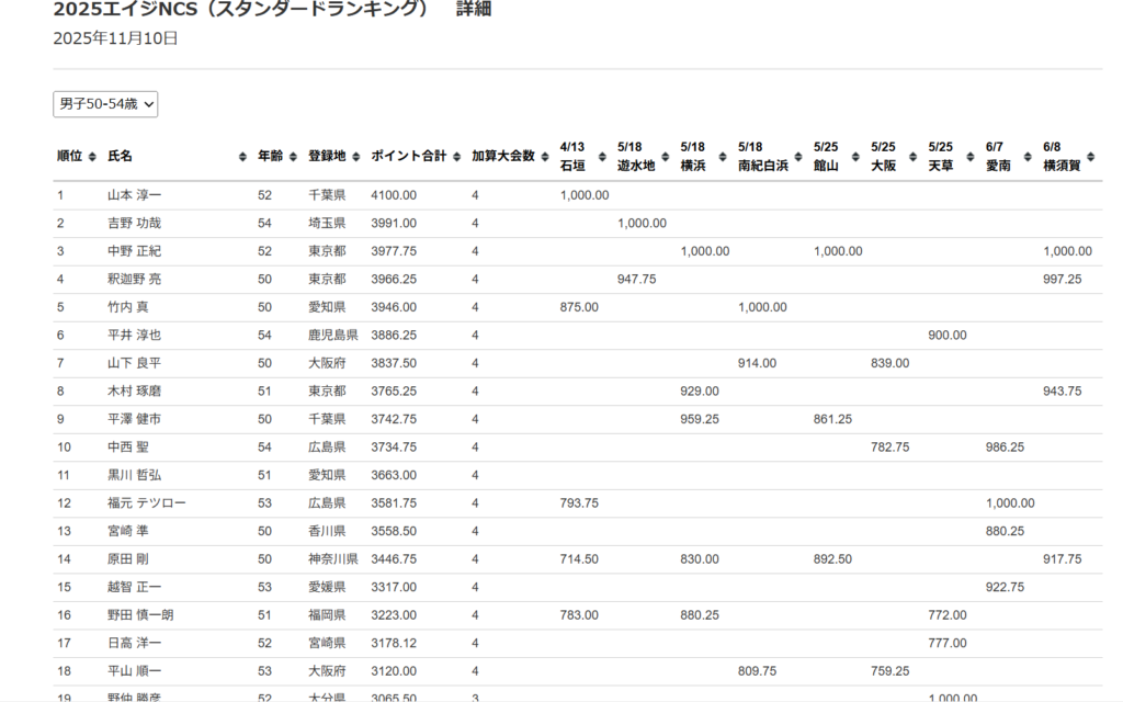 2025シーズンの50-54歳(スタンダード)エイジランキング(最終確定)。